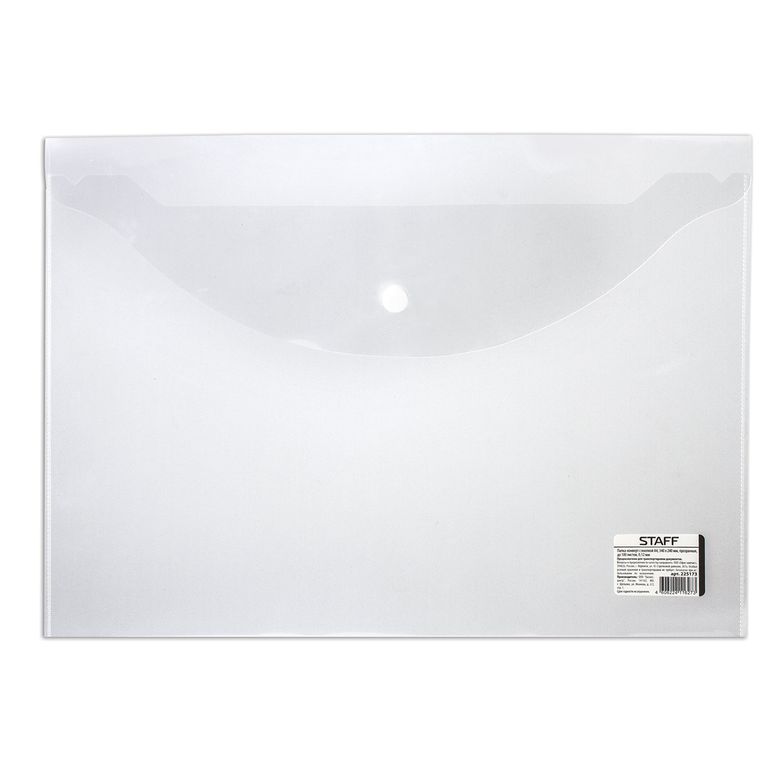 Папка-конверт с кнопкой Staff, А4, 340х240 мм, прозрачная, до 100 листов, 0,12 мм, 225173